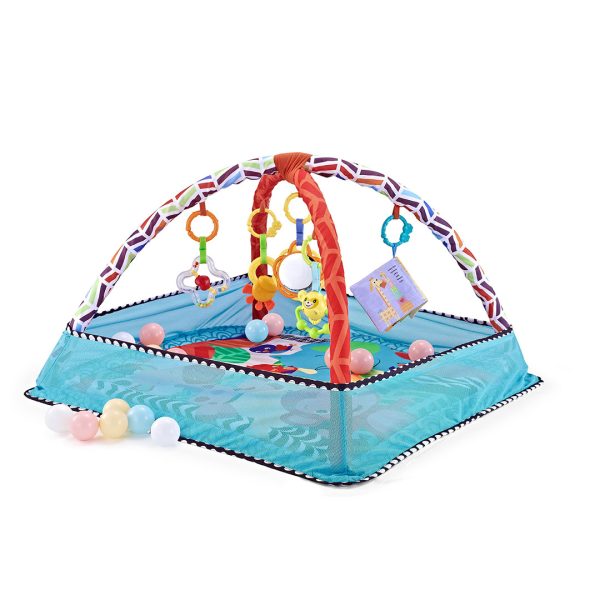- مزیت : کمک به تقویت قدرت بصری،لامسه،شنوایی و افزایش خلاقیت کودک- تشک دارای جنسی لطیف و ضد حساسیت- دارای 18 توپ پلاستیکی – دارای عروسک های آویزی که قابلیت نصب رو کالسکه